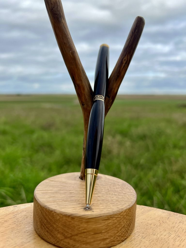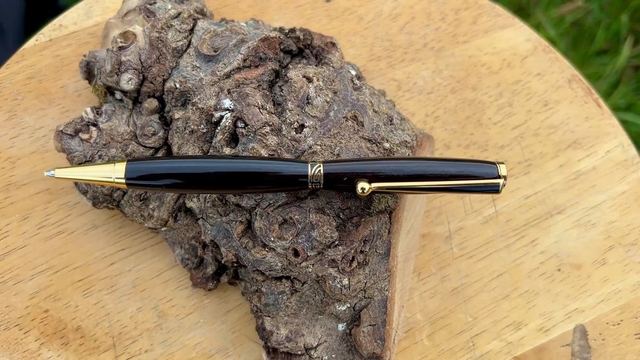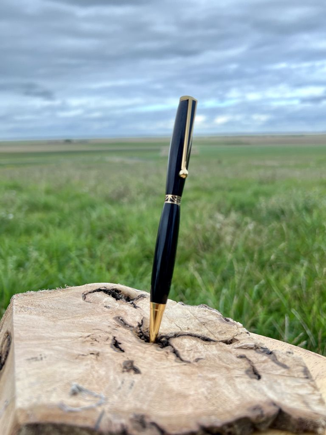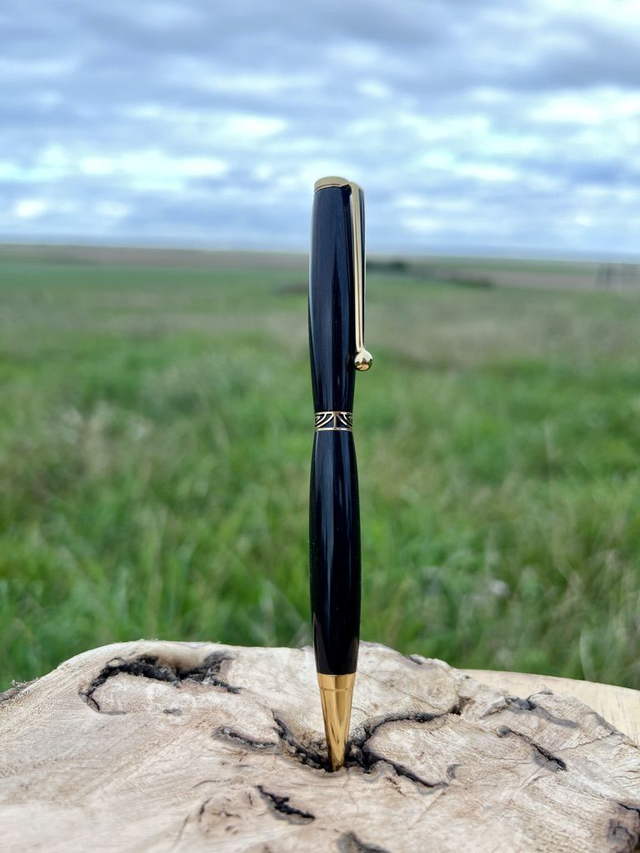 Stylo bille style art déco OR, anneau stylisé noir sur OR plaqué OR 24K, monté sur du Goncalo. Pratiques et élégants, ils sont parfaits pour un usage quotidien. Laissez-vous séduire par l’élégance naturelle de ce stylo façonné dans un bois exotique rare : le Goncalo. Tourné entièrement à la main, il allie le charme chaleureux du bois précieux à la finesse de finitions dorées, pour un résultat à la fois intemporel et raffiné.