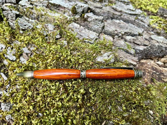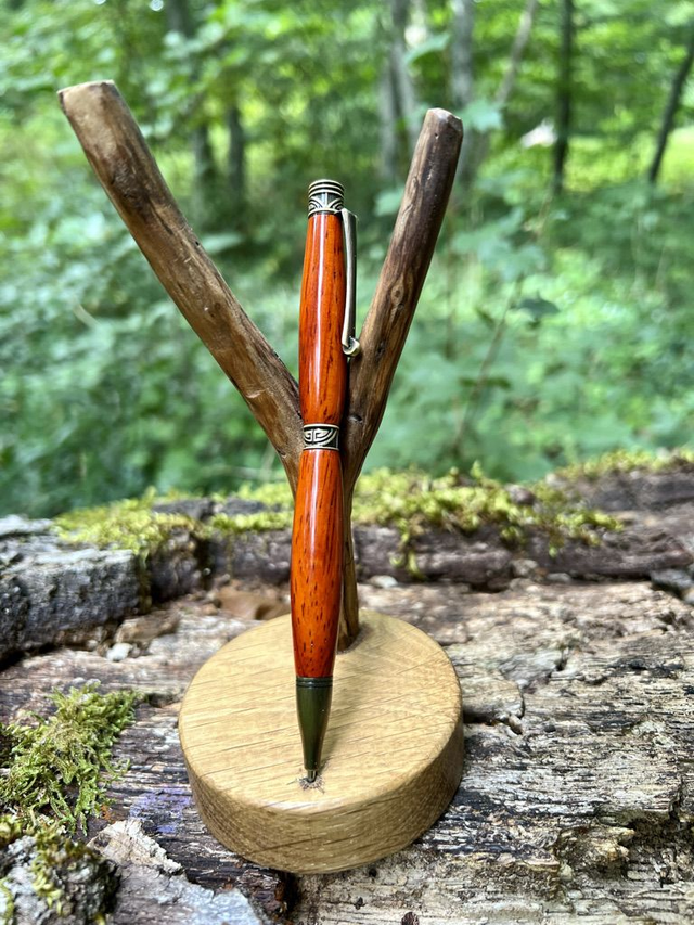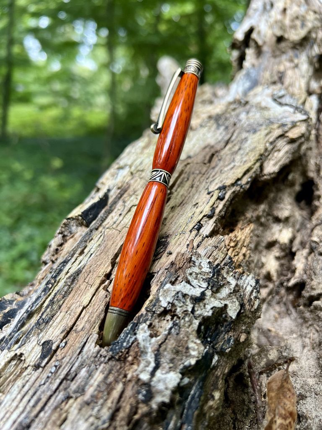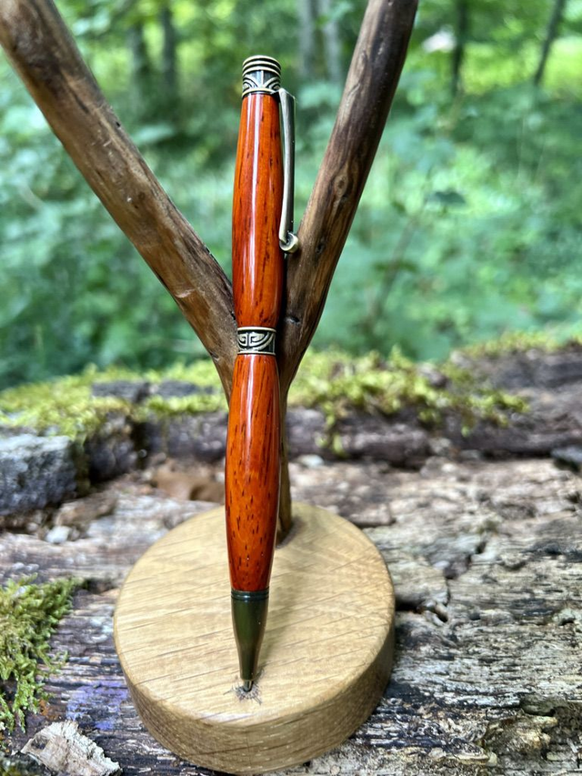 Stylo bille style cyclotron gris est un stylo unique, monté sur du Padouk. La monture en métal sombre, sobre et élégante, crée un contraste saisissant avec la chaleur du bois. Elle souligne la silhouette élancée du stylo, équilibrée et ergonomique, invitant naturellement à l’écriture. Sa finition lisse et brillante reflète la lumière avec subtilité, accentuant la noblesse du matériau.