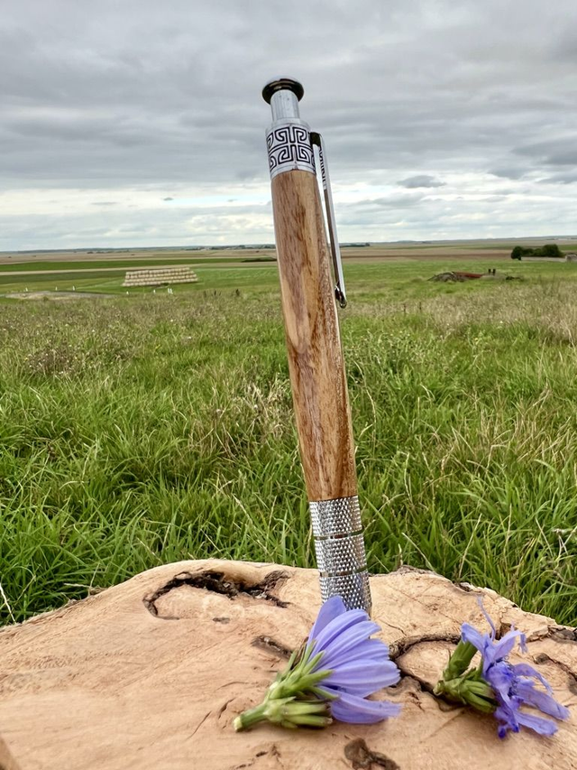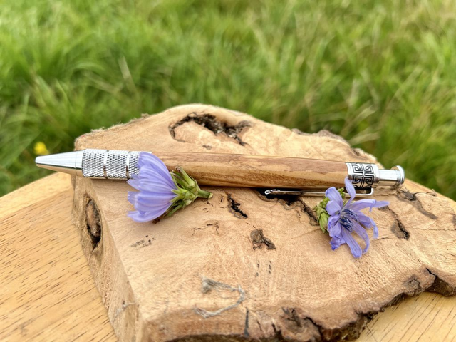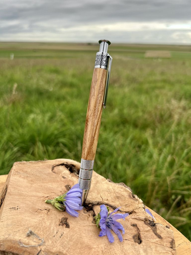Stylo bille ciselé avec poussoir monté sur du Frêne Olivier. Alliez élégance et praticité avec ce stylo à clic artisanal façonné en bois de frêne olivier. Sa teinte claire, sublimée par des veines naturelles uniques, lui confère un style moderne et raffiné.