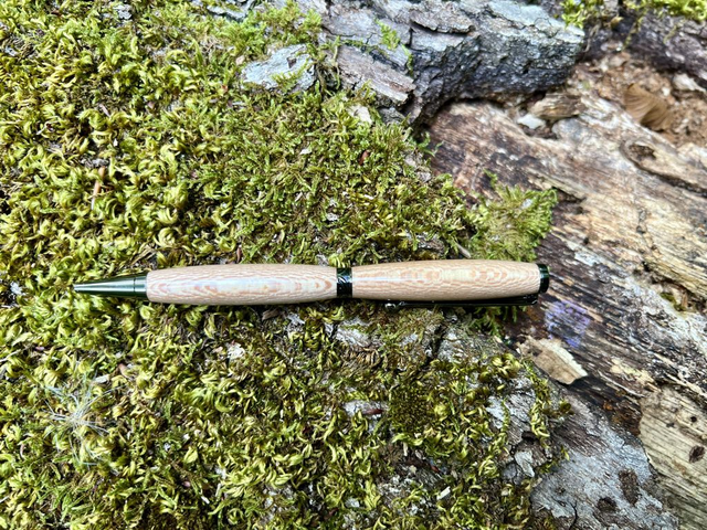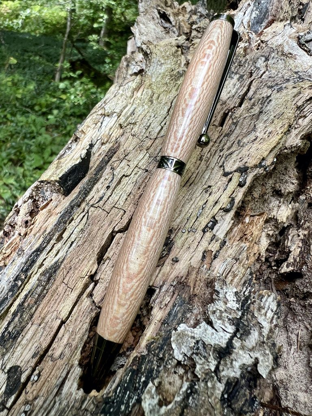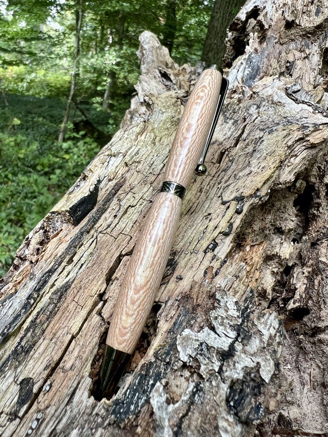 Stylo bille style art déco gris monté sur du Platane. Ce stylo unique est réalisé à la main dans du bois de platane, dont le veinage clair et délicat lui confère une élégance naturelle. Son design est rehaussé par une bague Art Déco finement ciselée, qui apporte une touche raffinée et intemporelle. L’équilibre parfait entre le bois chaleureux et le métal travaillé en fait un instrument d’écriture aussi agréable à utiliser qu’à contempler.